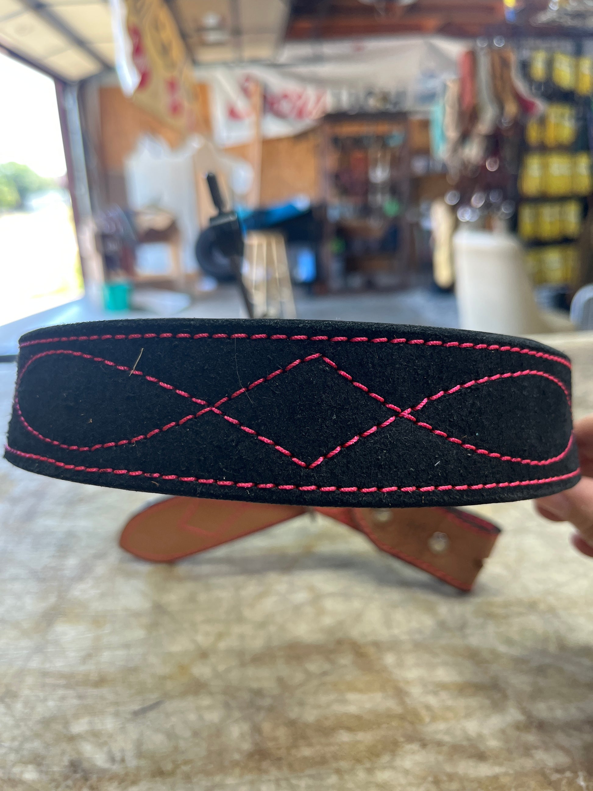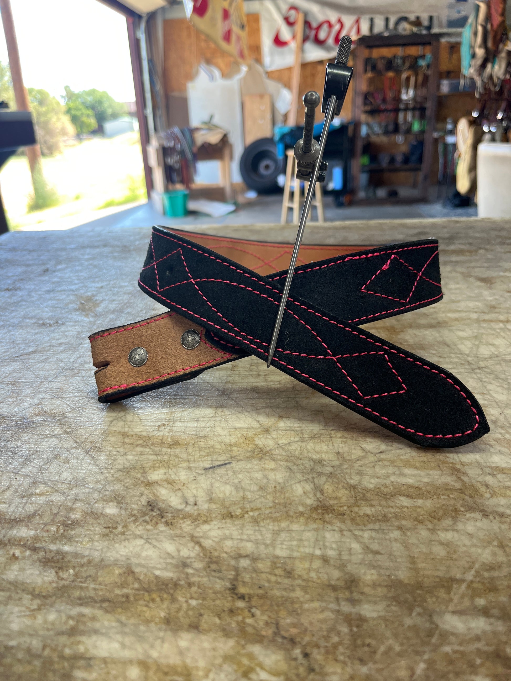 Pink stitched on black belt! From bend to tip is 34 inches and from bend to middle hole is 25.5 inches.