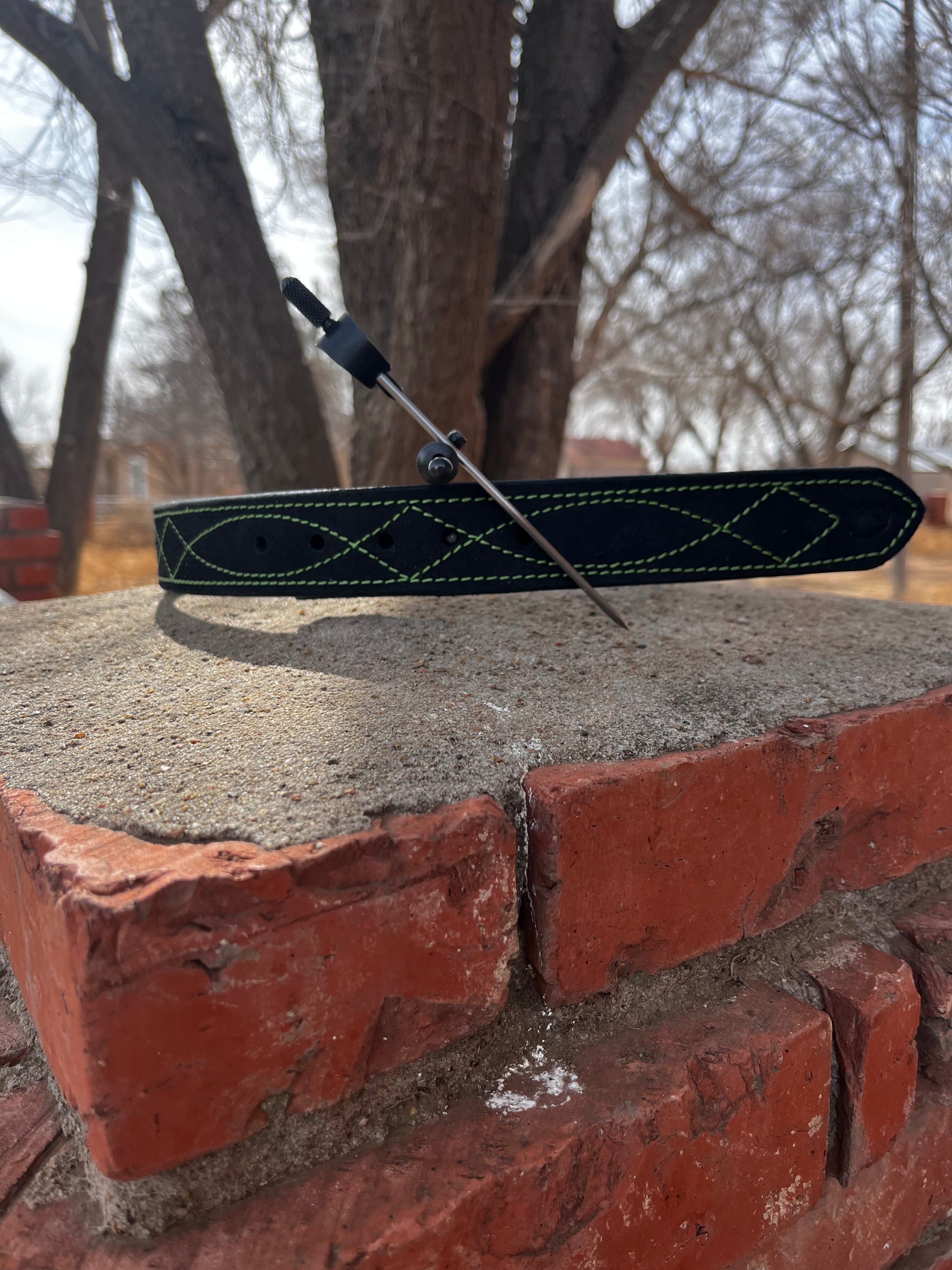 Black belt with green stitching. Measuring from bend to middle 46 inches, from bend to tip 54 inches.