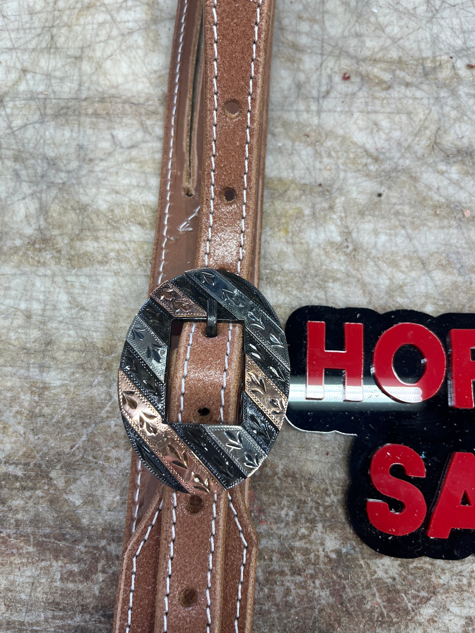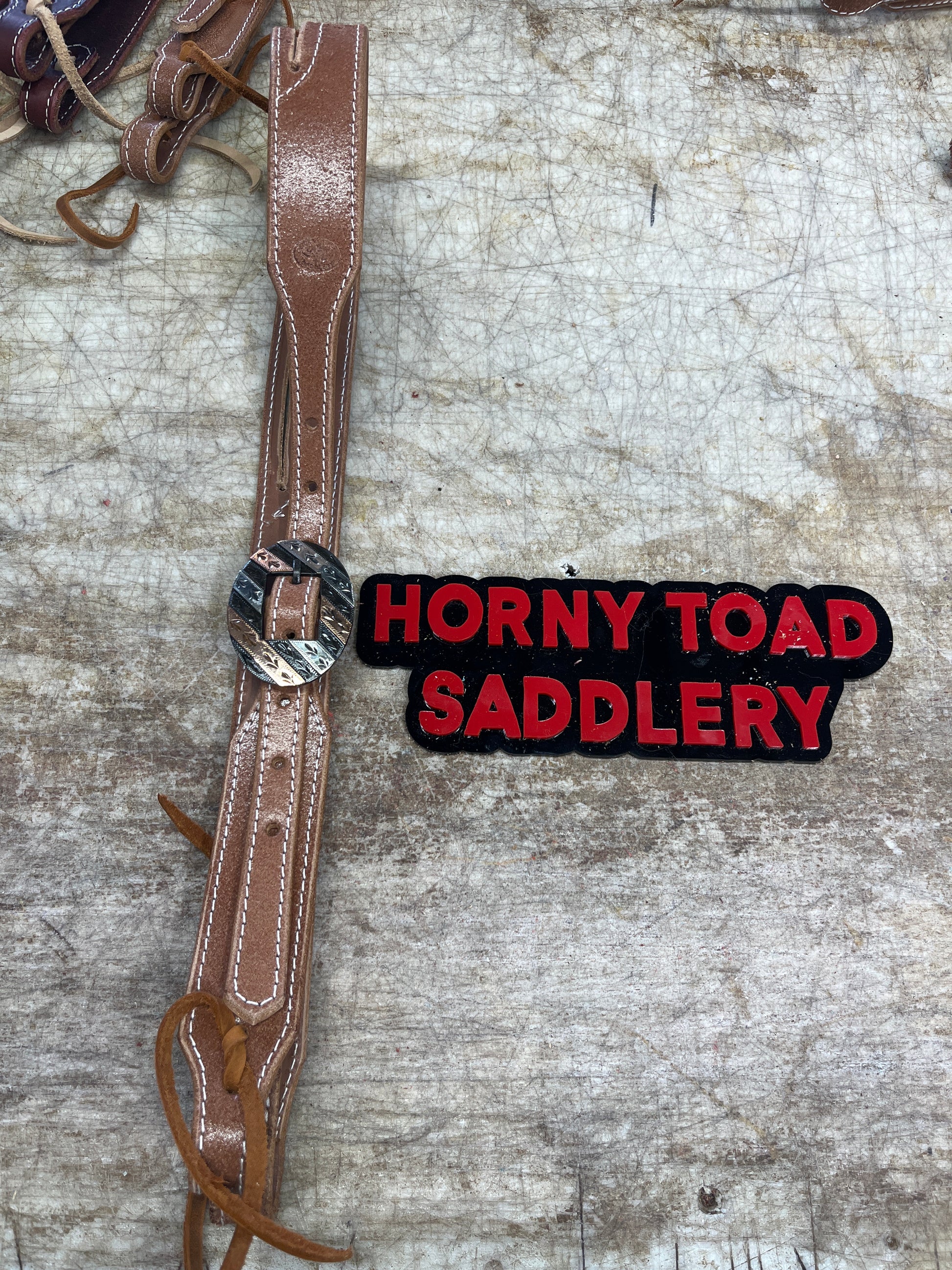 Handmade stamped buckle 3/4 buckle on a harness headstall made by Horny Toad Saddlery.