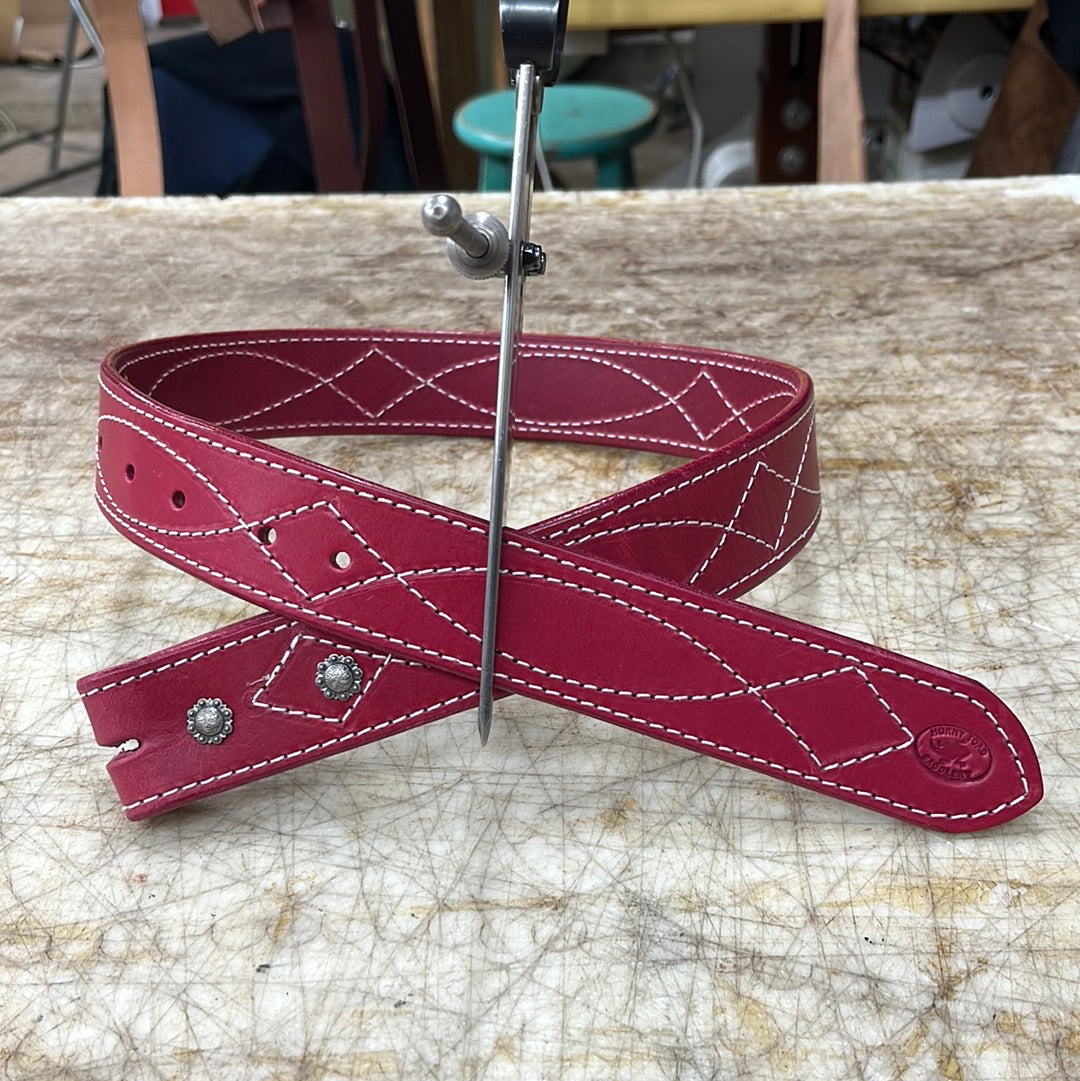 This awesome pink belt measure from the bend to middle whole is 26 inchs. From bend to tip 35 inches.
