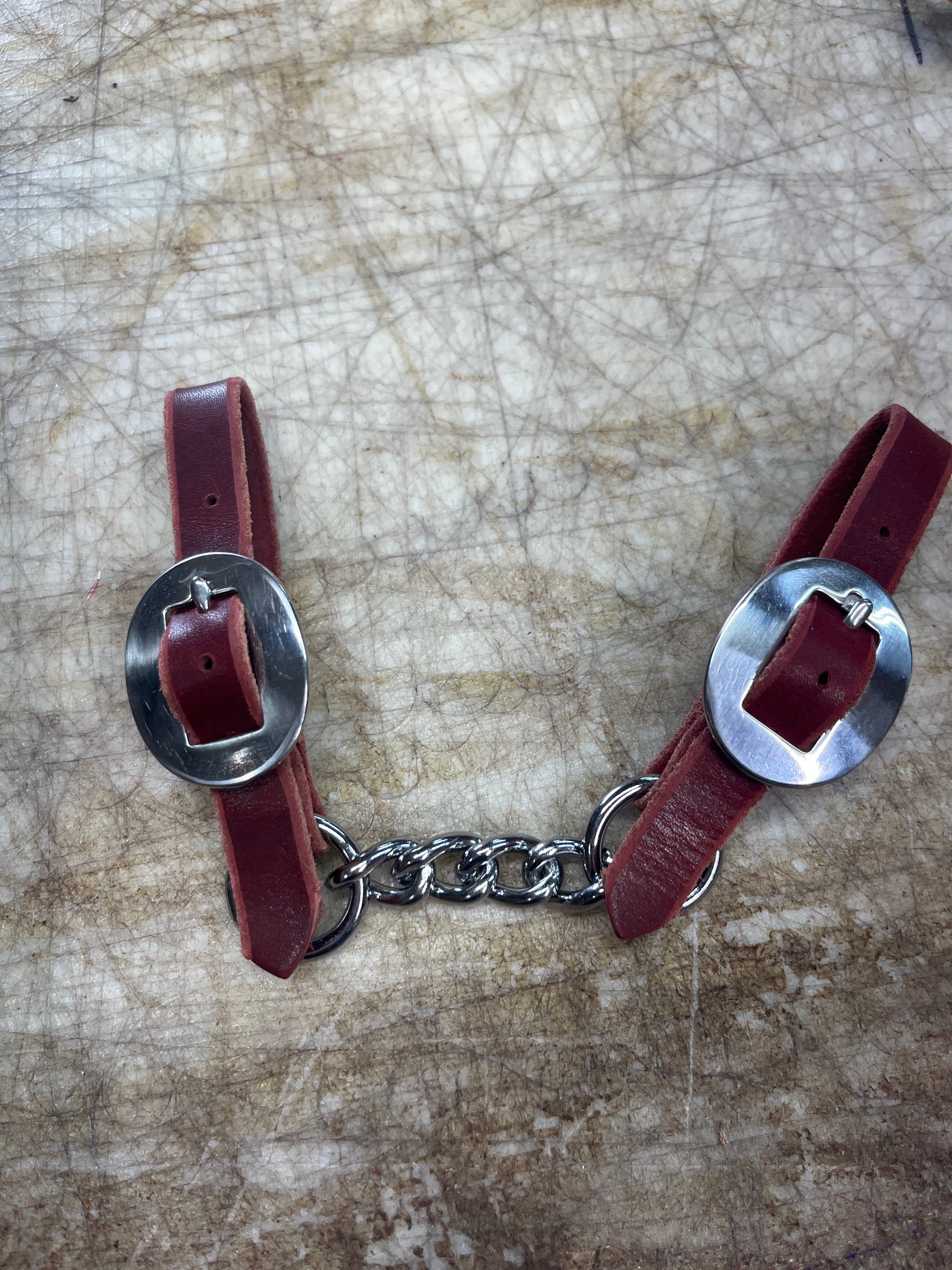 Very nice handmade curb chains with nice latigo leather.