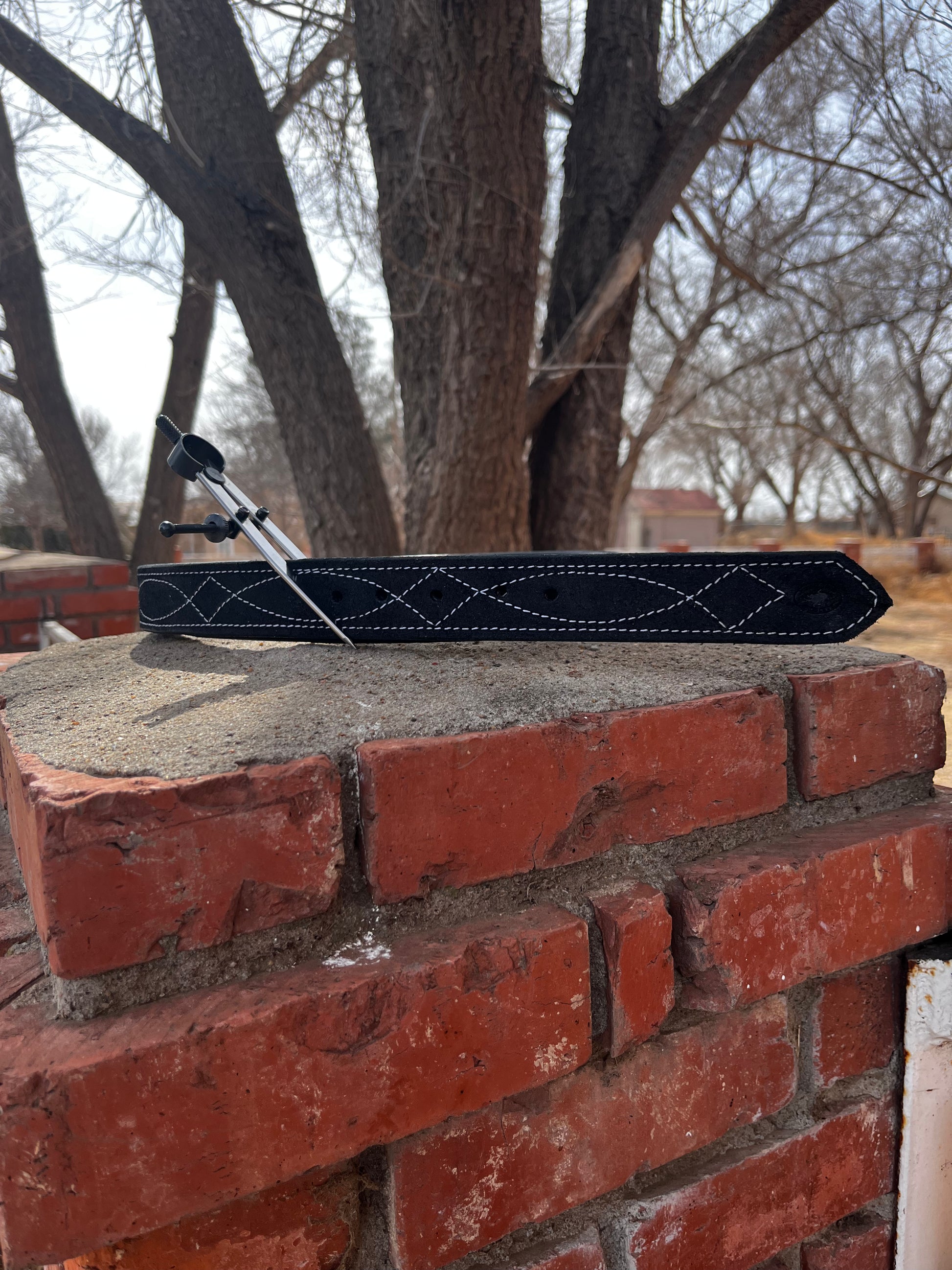 Black belt with white stitching. Measuring from bend to middle 46 inches, from bend to tip 56 inches.